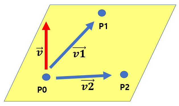 평면이 세 점 P0, P1, P2를 그림과 같이 포함한다고 하겠습니다. 해당 세 점을 바탕으로 벡터 V1 = P1 – P0과 벡터 V2 = P2 – P0을 정의할 수 있습니다. 그리고 벡터 V1과 벡터 V2의 외적를 구한 후 정규화하여 벡터 V를 구할 수 있습니다.