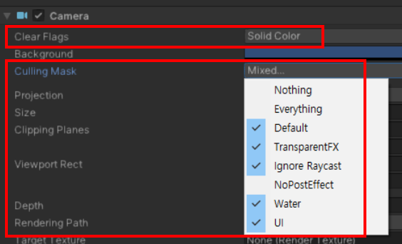 메인 카메라의 ClearFlag를 Solid Color로 설정합니다. 다음으로 메인 카메라에서 포스트 이펙트를 적용하지 않을 레이어를 Culling Mask에서 제외합니다. 다른 말로 하면 메인 카메라의 포스트 이펙트를 적용할 레이어들만 선택합니다.