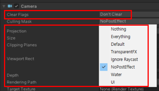 보조 카메라의 ClearFlag를 Don’t Clear로 설정합니다. 이렇게 하면 메인 카메라 내용 위에 보조 카메라의 내용이 겹치게 됩니다. 이 예제에서는 보조 카메라에 포스트 이펙트를 적용하지 않는 관계로, 포스트 이펙트를 적용하지 않고 그리기 위하여 메인 카메라에서 선택하지 않은 레이어들을 보조 카메라의 Culling Mask에서 선택합니다.
