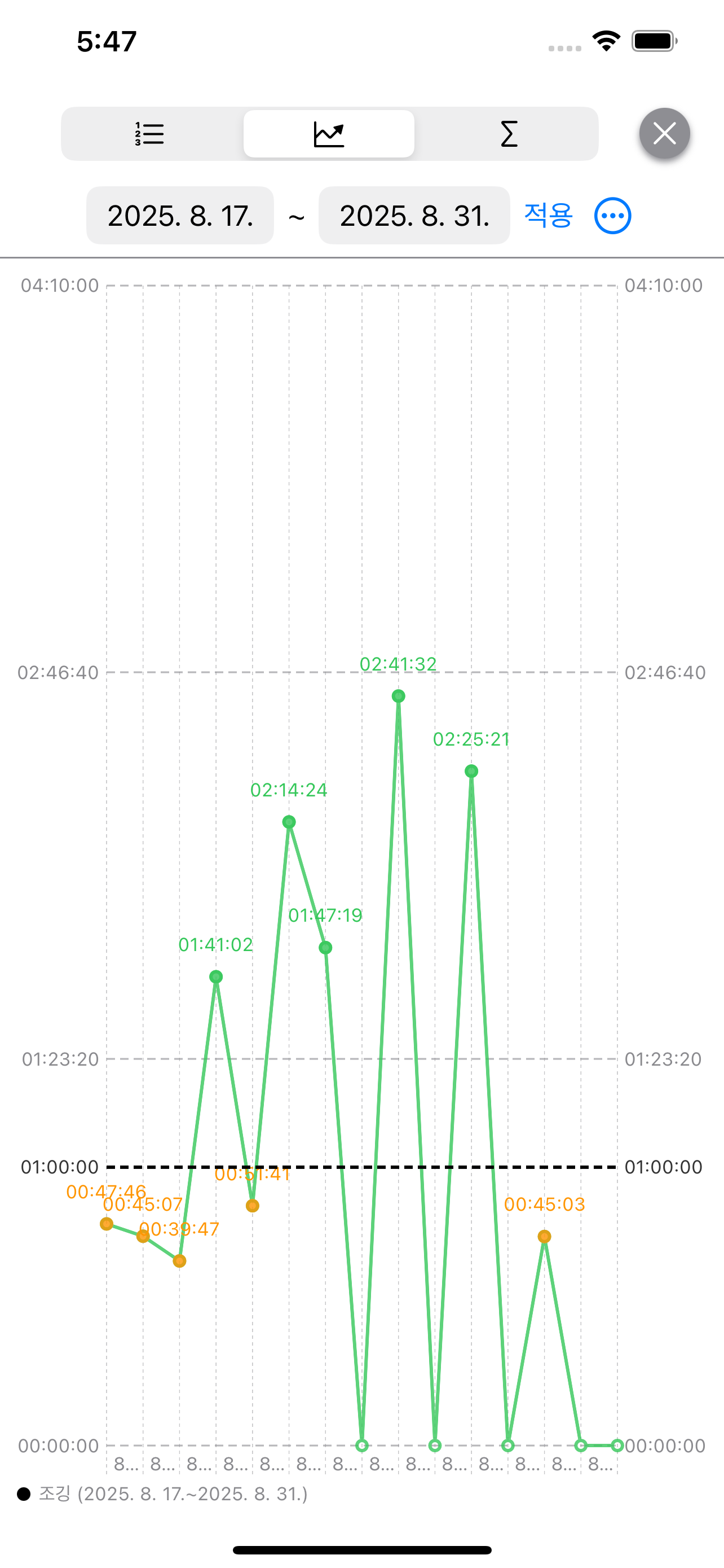 디자인에 관한 두번째 철학은 하루 단위로 기록한다는 점입니다. 이 철학을 극명하게 보여주는 것이 사용 시간을 측정할 때 하루를 넘어가게 되면 자동으로 사용 시간이 하루 단위로 나누어 집니다. 또한 하루에 사용 시간을 추가로 측정할 때도 기존 측정 시간에 더해져서 측정된다는 점입니다. 모든 데이터를 하루를 기준으로 기록되지만 몇 번에 나누어 기록하고 싶으면 항목을 추가로 만들어 할 수도 있습니다.
