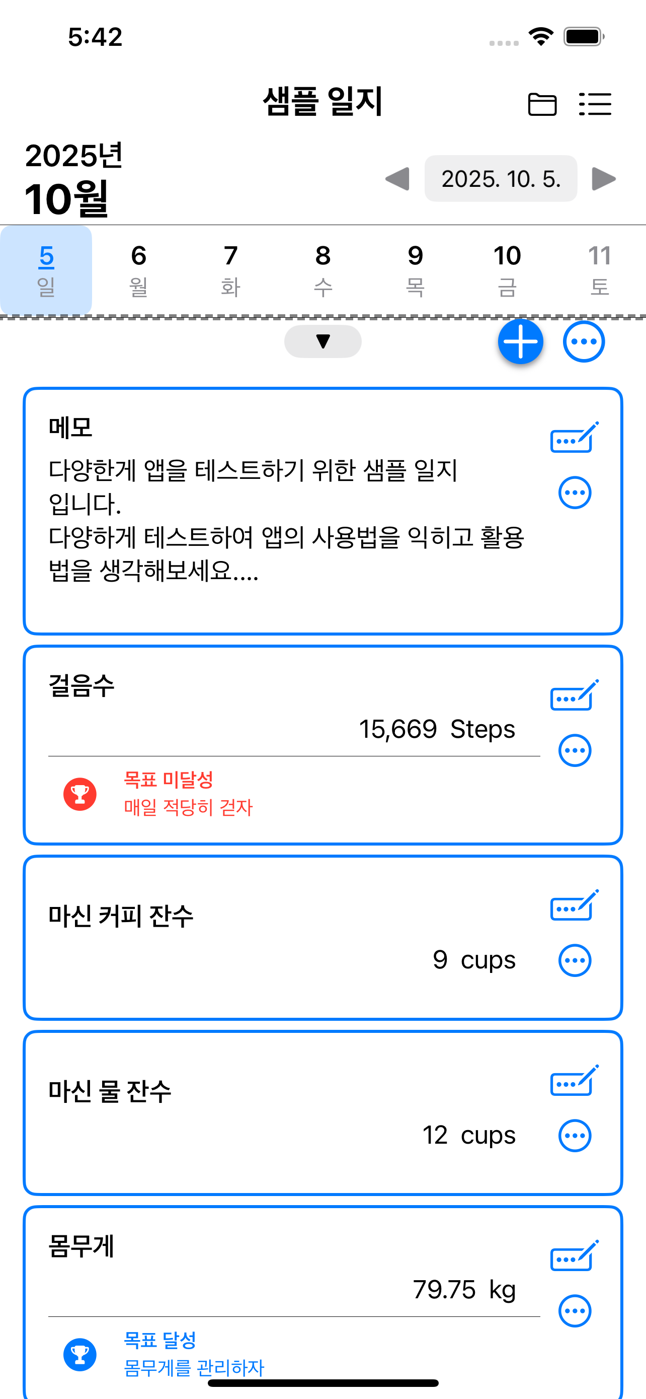 앞에서 살펴본 것과 같이 자신의 하루를 다양한 데이터로 기록하고 분석하는 앱이지만 하루를 기반으로 데이터를 저장하는 모든 일에 사용이 가능한 앱입니다. 필요에 따라 여러 개의 일지를 만들어 종류별로 기록을 관리할 수 있습니다.