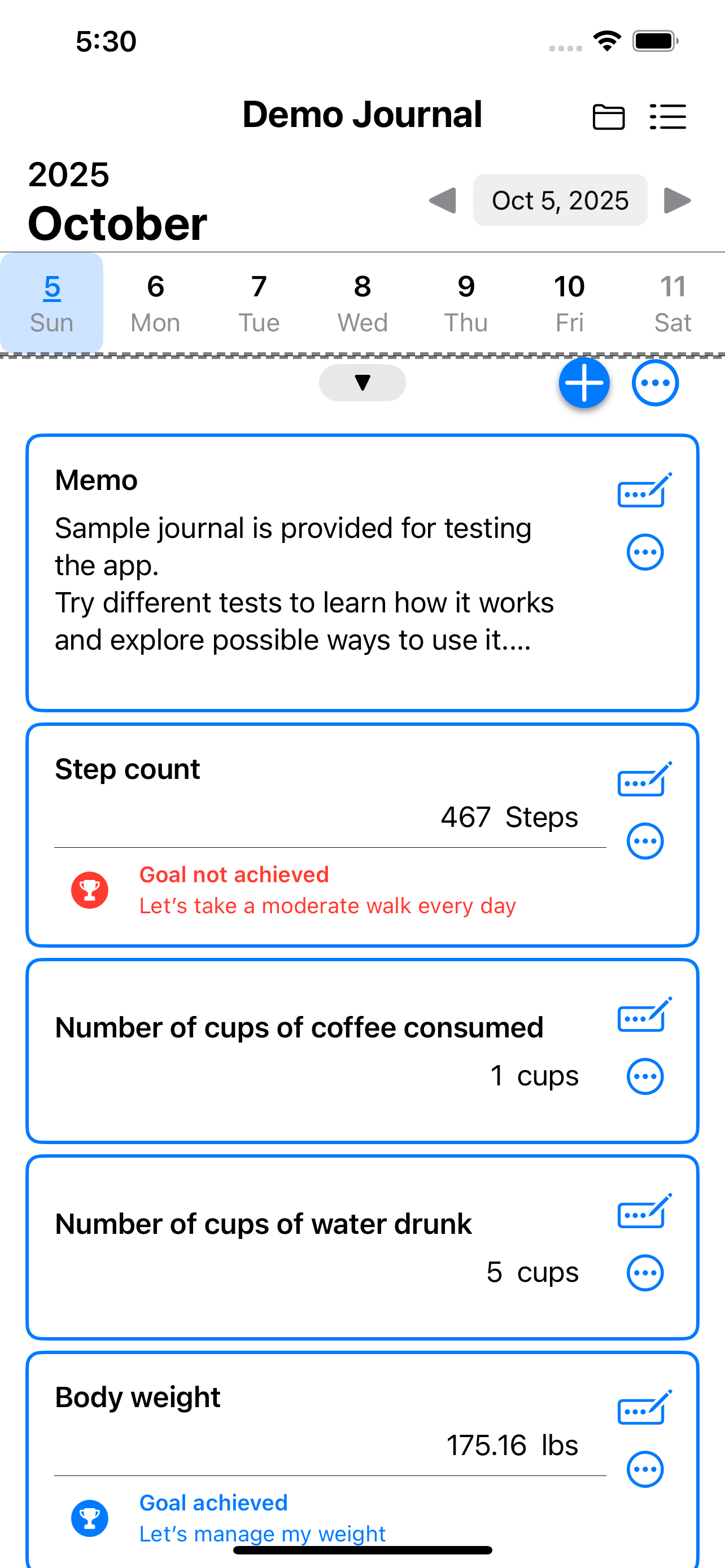 The core design philosophy of My Own Daily Record is to record your day not through text or photos, but through data. Following this principle, the app allows you to create an unlimited number of custom items based on five fundamental types — Memo, Check, Number, Decimal Number, and Time — to record every aspect of your day. What sets it apart from other apps is its focus on the rational side of daily life — capturing data — rather than the emotional side expressed through writing or images. Of course, since it also supports the Memo type, you can still write down your thoughts easily, just like in other journaling apps.