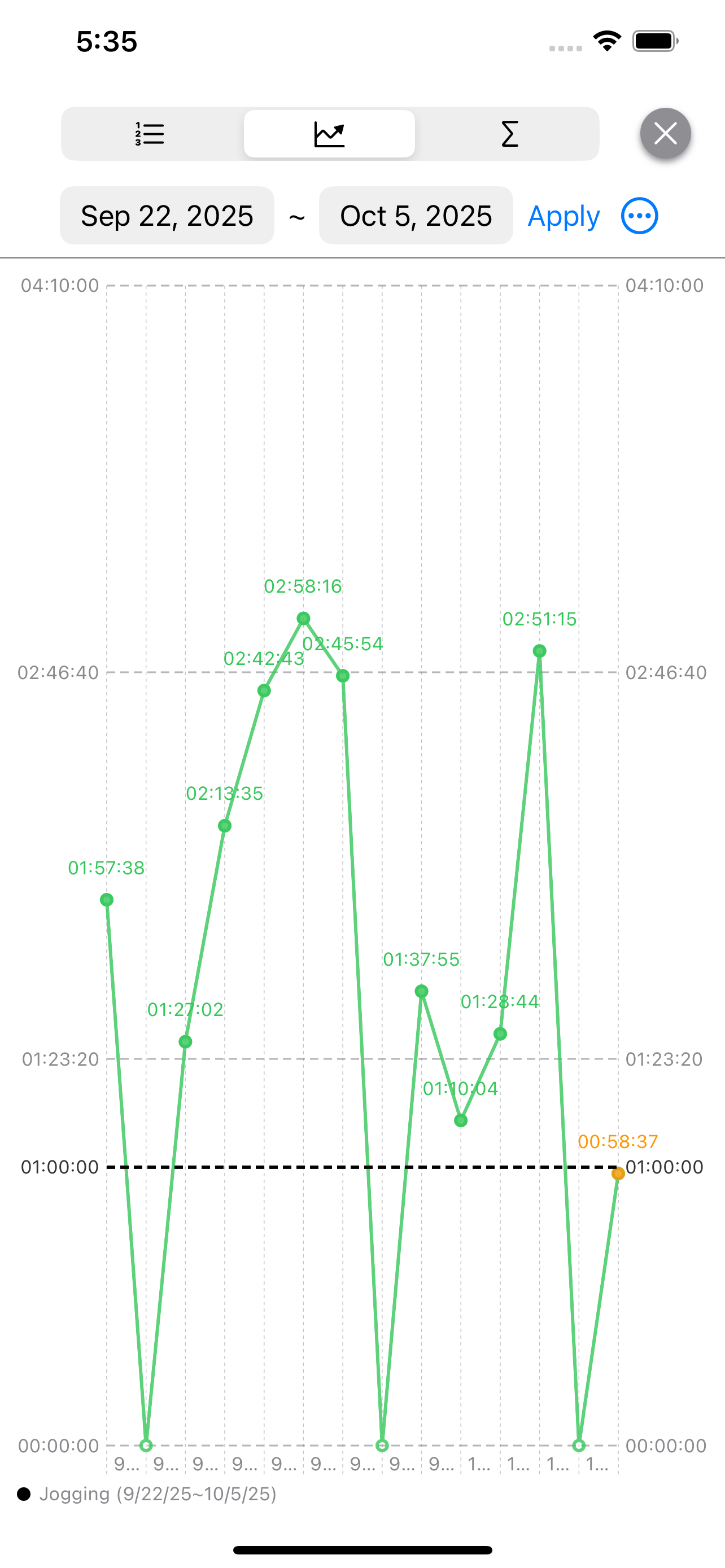 The third design philosophy is to make the most of the recorded data. This is also the reason why each day is recorded as data — the goal is to analyze it and reflect on your own life. In the sample journal shown when you first install the app, for example, the jogging time record lets you compare how your activity has changed over a specific period. You can also compare the time spent jogging with the time spent on muscle training. In this way, you can visually review your daily records through charts, and sometimes analyze or reflect on them by comparing different time periods or activity types. Although the examples here use exercise, this approach can also be useful for students or exam takers, helping them see how much time they actually spend studying specific subjects.